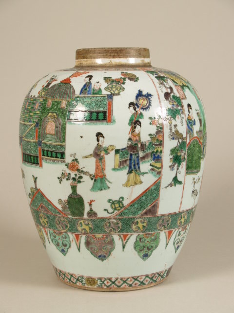 Pot met decor van figuren in exterieur en met symbolen, famille verte (Q21385)