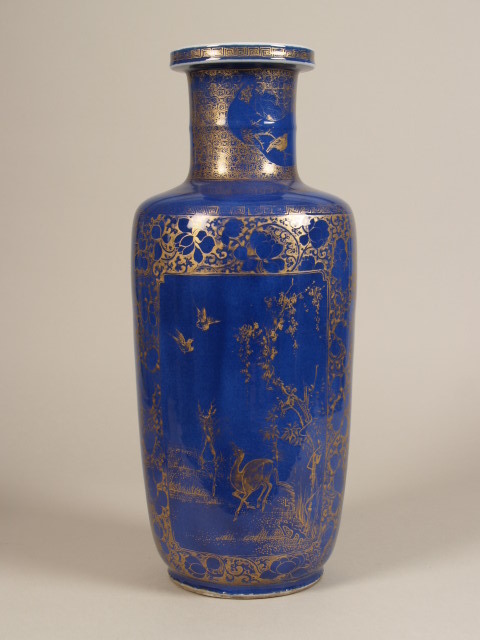 Over het glazuur heen versiering in opgemoffeld goud. Op de buik een fond van in goud uitgespaarde ranken met bloemen; in dat fond uitgespaard 3 panelen met resp. een fênghuang met vogels, 2 fazanten in een boom en 2 herten omringd door vogels en een aap, alles in landschappen. Op de schouder een lijst van strigillen. Op de hals een tegelmotief-fond in goud, daarin uitgespaard 2 velden in de vorm van bladen, waarin resp. een landschap en een vogel op een tak. (Nederlands)