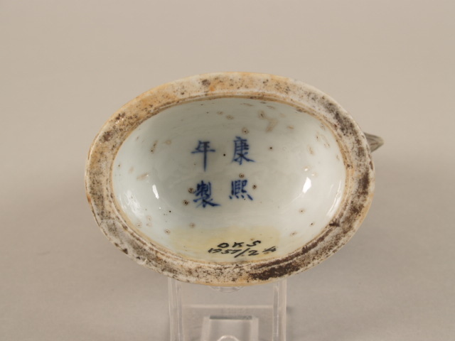 merk in blauw onder het glazuur onder op de bodem: "Kangxi nien chih" (Nederlands)