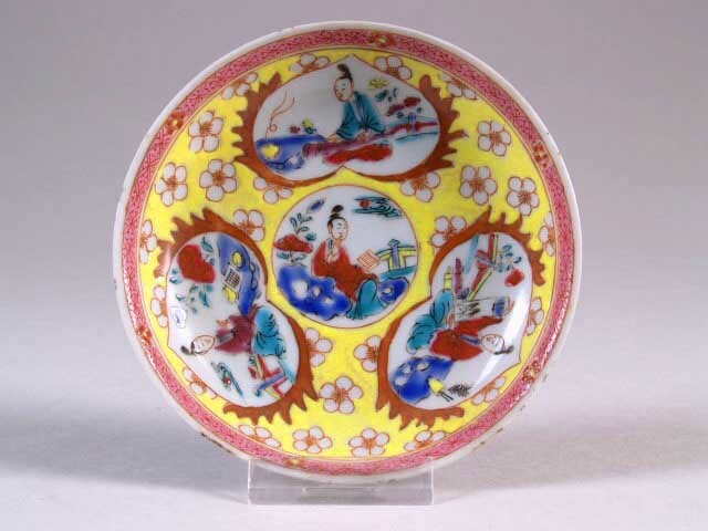 Schotel met polychroom decor van zittende vrouwfiguren (Nederlands)