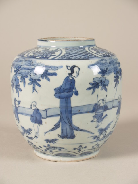 | Nederlands | Pot met decor van vrouwfiguren en zotjes in een tuinlandschap |