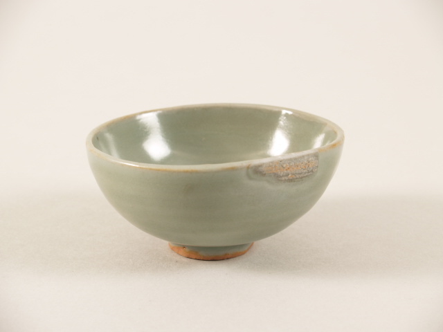 Kom bedekt met groen glazuur, Aan de binnenkant in het centrum in reliëf een decoratie van een bloemknop. Aan de buitenkant van de kom is bij de rand het glazuur op één plek deels weggetrokken tijdens het bakken in de oven. De voetring is ongeglazuurd. Celadon (Nederlands)