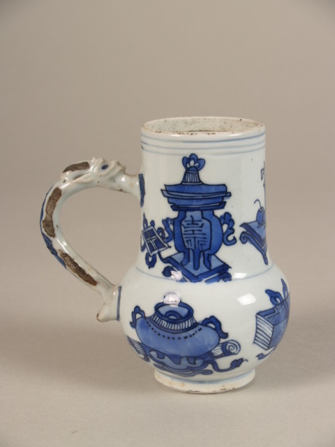 Decor in helder blauw op buik en hals: symbolen der wijzen. (Nederlands)