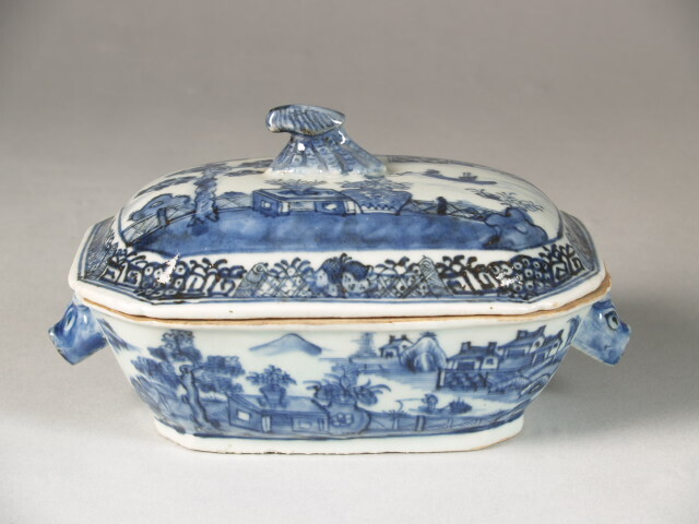 | Nederlands | Dekschaal met deksel en decor van tuinlandschap aan een rivier, chine de commande, 1 van 2 |