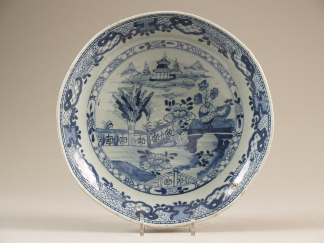 Bord, diep, met golvende rand en decor van tuinlandschap aan een rivier (Q21426)