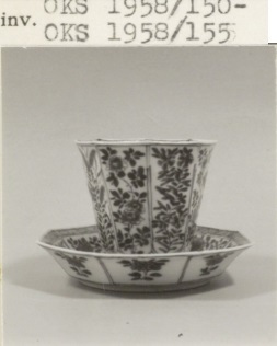 rechte bodem, rechte voetring, bolspreidende onderbuik, daarna recht spreidende achthoekige wand met licht uitgebogen liprand. materiaal: poselein. Versiering: in kobaltblauw: acht vlakken elk met een bloeiende plant; een gearceerde zigzagrand. Spiegel van schotel 150 een bloem, spiegel van alle andere schotels: een vierkante rozet. (Nederlands)