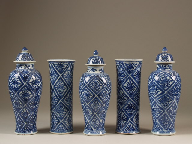 Kaststel bestaande uit 3 potten met deksel en 2 rechte vazen en met decor van ruiten waarin bloemen (Nederlands)