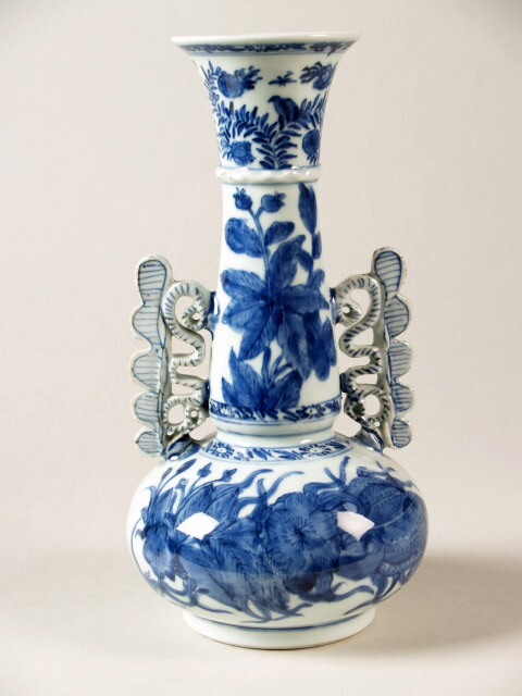 Vaas, vleugelvaas, met 2 krullende oren, met decor van bloeiende planten (Nederlands)