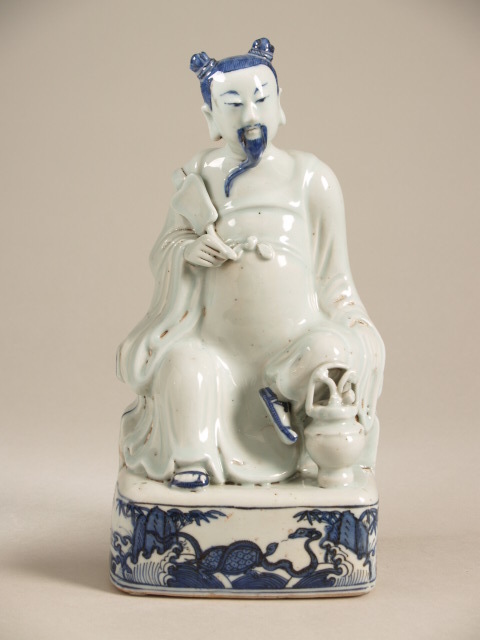 Beeld van porselein, beschilderd in onderglazuur blauw. Op voetstuk in de vorm van de Taoïstische onsterfelijke Zhongli ...kend als de 'Zwarte Krijger' en vertegenwoordigt het noorden en de winter.||China||Keramiekmuseum Princessehof OKS 1960-009