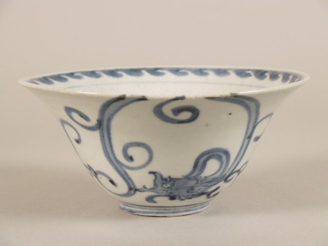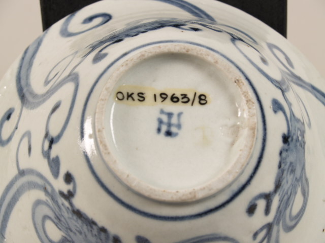 Kom beschilderd in onderglazuur blauw. Aan de binnenkant is op het plat een dubbele ring te zien en aan de rand een band met een wolkenmotief. De buitenzijde is gedecoreerd met drie drakenkoppen die overgaan in ranken. Op de bodem een swastika. (Nederlands)