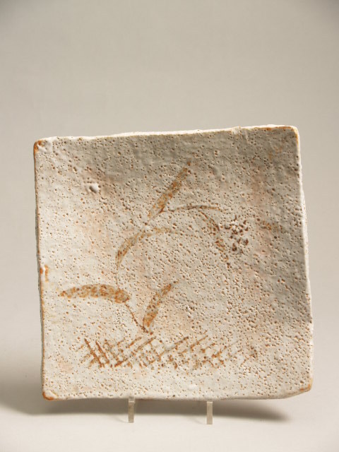 Vierkant bord bedekt met oranje sliblaag en wit tinglazuur. Daarop in grijs glazuur een voorstelling van een hek en bloeiende plant (Nederlands)
