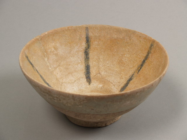 Kom met iriserend wit alkaliglazuur en verticale blauwe strepen (Nederlands)