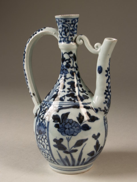 Tuitkan beschilderd in onderglazuur blauw. Op de buik zijn vakken te zien met een decoratie van een pioen in een landschap afgewisseld met vakken gedecoreerd met een motief van een pioen en ranken. De hals is opgedeeld in twee zones met een verdikking in het midden. De onderste zone is gedecoreerd met bloemen en bloemranken en de bovenste zone met een motief van ranken. De tuit, die met een s-vorm verbonden is met de hals, en het oor zijn gedecoreerd met ranken. (Nederlands)