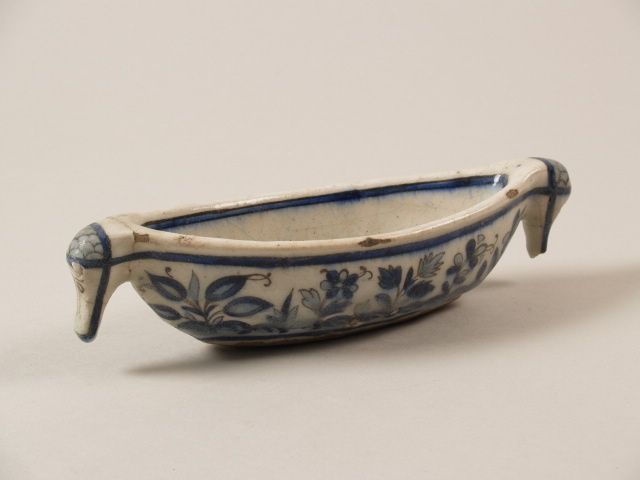Schaaltje in de vorm van eeen boot met aan weerszijden vogel/eendenkoppen. Het schaaltje is gedecoreerd met een landschap van bloemen en planten. Dit soort schaaltjes zijn waarschijnlijk bedelschaaltjes en staan bekend als kashkul, ze werden oorspronkelijk van kokosnoten gemaakt en later in metaal en andere materialen, waaronder keramiek. Met deze schaaltjes werden aalmoezen opgehaald. Ze werden later ook wel gebruikt voor eten of het drinken van wijn en werden zo meer decoratieve objecten. De boot/halve maan vorm verwijst naar Sufi mystici en het reinigen van hun ziel en het afstand doen van wereldse bezittingen. (Nederlands)