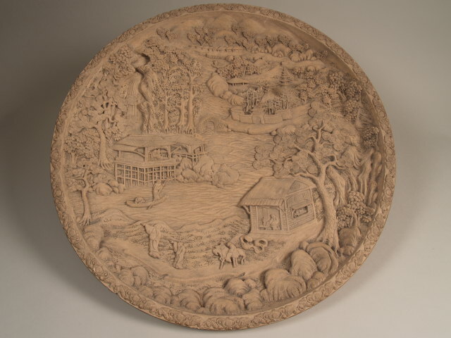 Schotel met decor van rivierlandschap in reliëf (Nederlands)