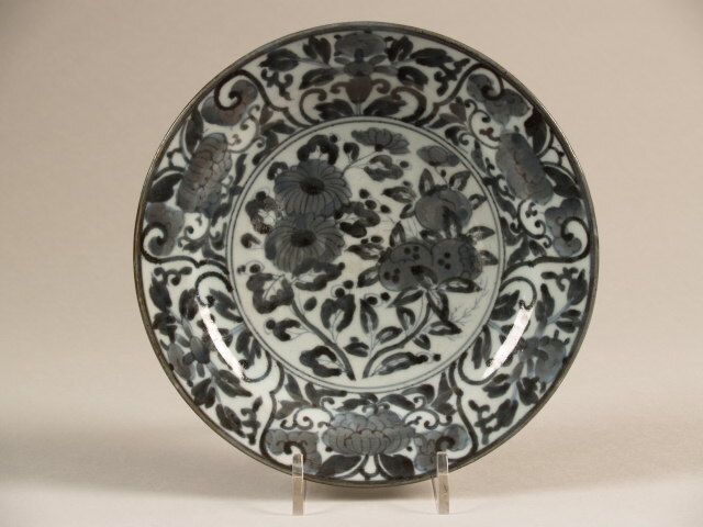 Bord beschilderd in onderglazuur kobaltblauw dat grijszwart is uitgeslagen. Op het plat bloem- en fruittakken. Op de wand zes vlakken met bloemranken. Gekleurde rand. (Nederlands)