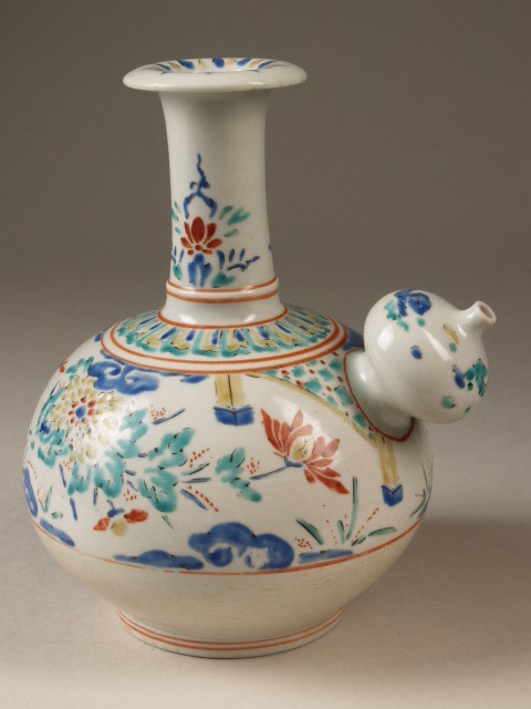 Kendi beschilderd in onderglazuur blauw en op het glazuur in groen, geel, rood en zwart. Op de buik vanaf het centrum ge...and is gedecoreerd met strepen. Kakiemon-stijl.||Japan||Arita||onbekend||onbekend||Keramiekmuseum Princessehof OKS 1966-050 |