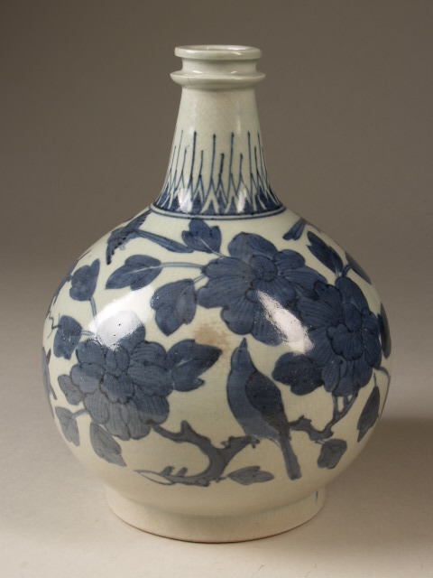 Flesvaas beschilderd in onderglazuur blauw. Op de wand een decoratie van bloemen en ranken, met daartussen drie vogels. Op de hals zijn naar bovengerichte punten te zien. Op de bodem staat de inscriptie ‘’IC’’ binnen een bladerenkrans. Mogelijk staat de inscirptie ‘’IC’’ voor Johannes Camphuys (1634-1695). Hij was in de periode 1671-1676 meermaals opperhoofd van het eiland Deshima. Mogelijk heeft hij opdracht gegeven om deze fles te vervaardigen. (Nederlands)