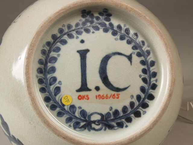 Onderop binnen een bladerkrans in blauw onder het glazuur "I.C." (Ioannes Camphuys) 1634-1695 of Johannes Crans (Nederlands)