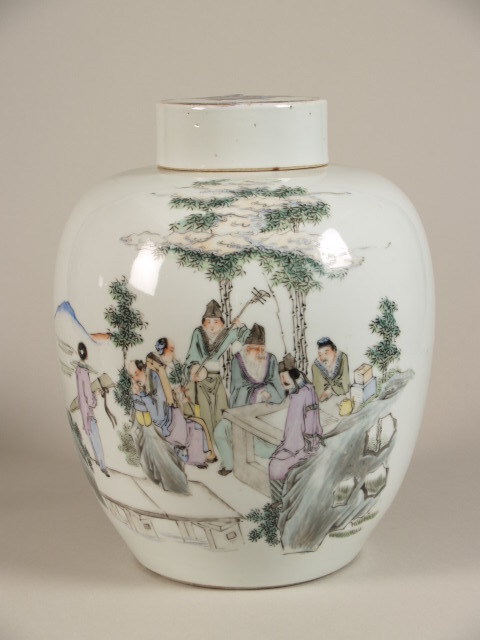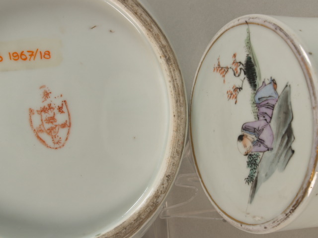 Pot met deksel en decor van figuren en tekst (Nederlands)
