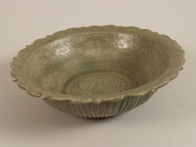 Schotel met geschulpte rand en ingegrift decor, celadon (Nederlands)