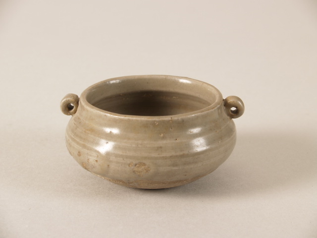 Kom bedekt met grijsgroen glazuur. Aan de buitenkant zitten aan weerszijden van de rand twee ringvormige lusjes. Celadon (Nederlands)