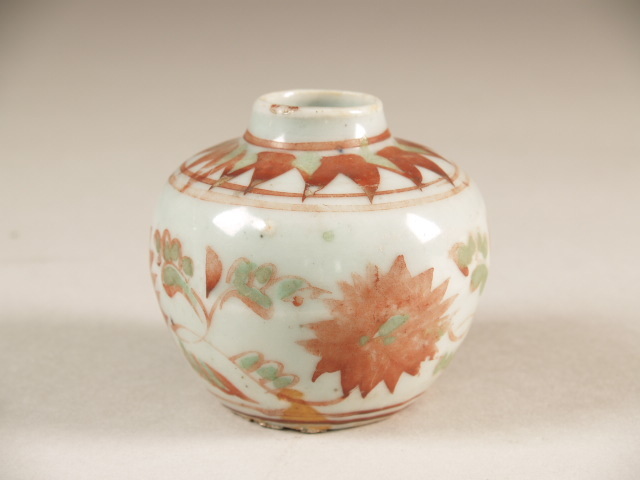 Potje met floraal decor in ijzerrood en groen email (Q21583)