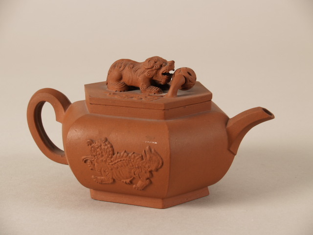 Theepot, zeshoekig, met decor van boeddhistische leeuwen en knop in de vorm van een leeuw (Nederlands)