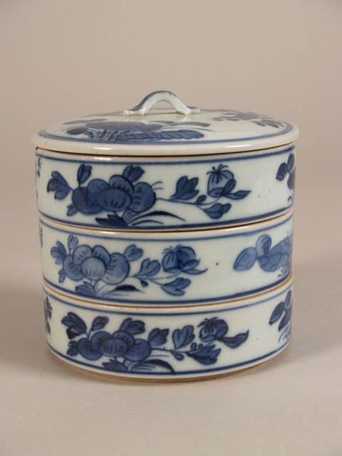 Drie-delige dekselpot beschilderd in onderglazuur blauw. Van alle drie de delen is de wand gedecoreerd met gestileerde bloemen afgewisseld met biezen. De deksel is gedecoreerd met (drie?) bossen bloemen (Nederlands)