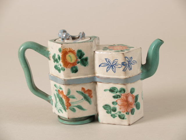 Theepot die optisch bestaat uit 2 vijfhoekige delen die door een gestrikt lint verbonden zijn en met een decor in emailkleuren (Nederlands)