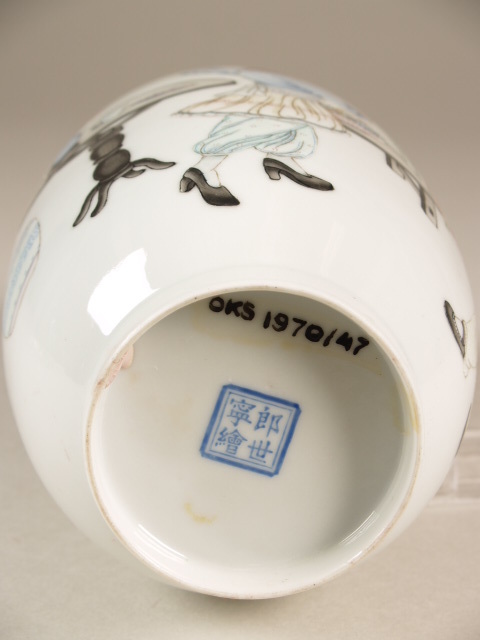 onderop in blauw op het glazuur : Lang Shining hui (verwijst naar Chinese naam Giuseppe Castiglione) (Nederlands)