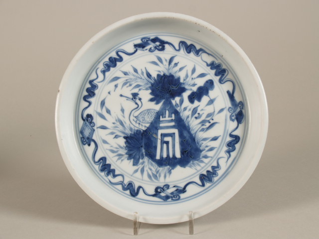 Schaal beschilderd in onderglazuur blauw. In het plat een decoratie van een piramide of rots met een symbool/karakter. Daarachter een kraanvogel (?) en verder bloemen en bladeren die uit de piramide ontspringen. Om deze decoratie heen is een band met krullende motieven en geluksymbolen. Blauw-wit Op een kom gevonden in het Ca Mau scheepswrak staat een zelfde symbool afgebeeld in het plat. (Nederlands)