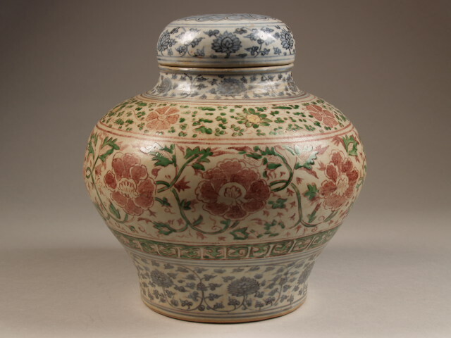 Wijnpot met balustervormige wand en holle smalle hals. Deksel met licht bolle wand en verjongende sluitring. Op de wand een voorstelling van pioenrozen met ranken en daarboven een rand van twee keer vier composieten onder een rand van ruyi ornamenten. Rondom de onderrand, de hals en de deksel een rand met lotusranken. Centraal op het deksel een geabstraheerde bloem. (Nederlands)