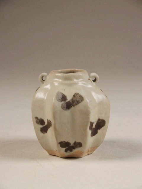 Pot met 2 oortjes, hoekige vorm en decor van stippen in onderglazuur koperrood (Q21683)