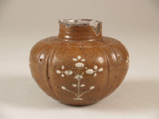 Pot zonder deksel met decor van 4 identieke bloemen in wit slib en radiale ribbels (Q21688)