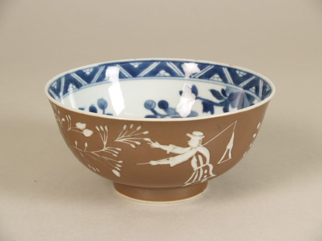| Nederlands | Kom met decor van 2 Europese mannen en 2 struiken, café au lait en onderglazuur blauw |