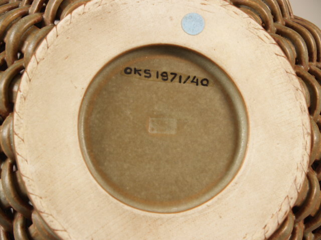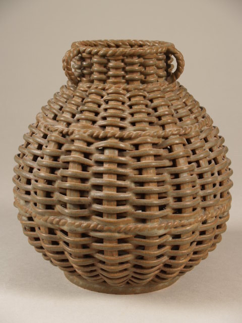 Beeld in de vorm van een mand met 3 oren, in nagebootst geglazuurd vlechtwerk (Nederlands)