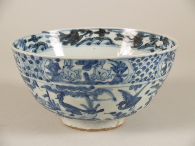 Kom met decor van eenden in tuin en band met cartouches waarin vlinders, vogels, eenden en konijnen (Nederlands)