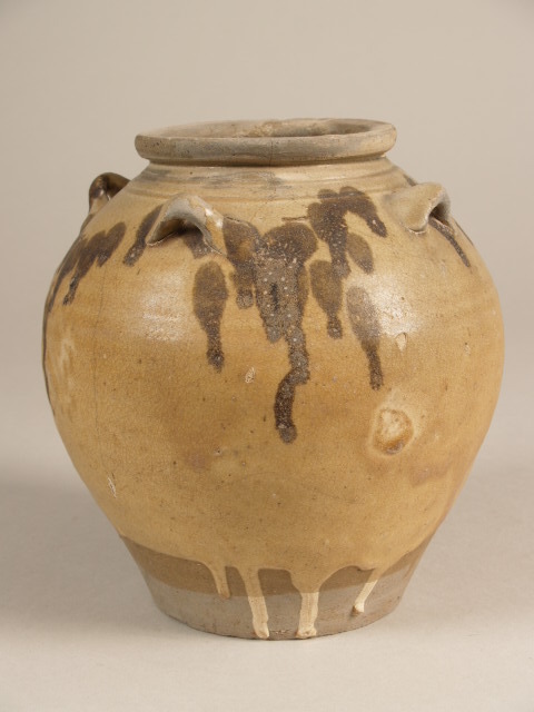 Bolle taps toelopende pot met vier oren bedekt tot bijna aan de onderkant met een bruingeel glazuur over een crèmekleurige glazuur. De pot is onder het glazuur gedecoreerd met uitlopende vlekken.||China||Keramiekmuseum Princessehof OKS 1972-023 |