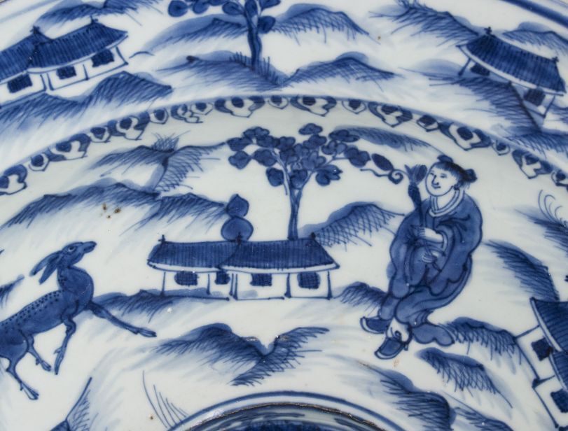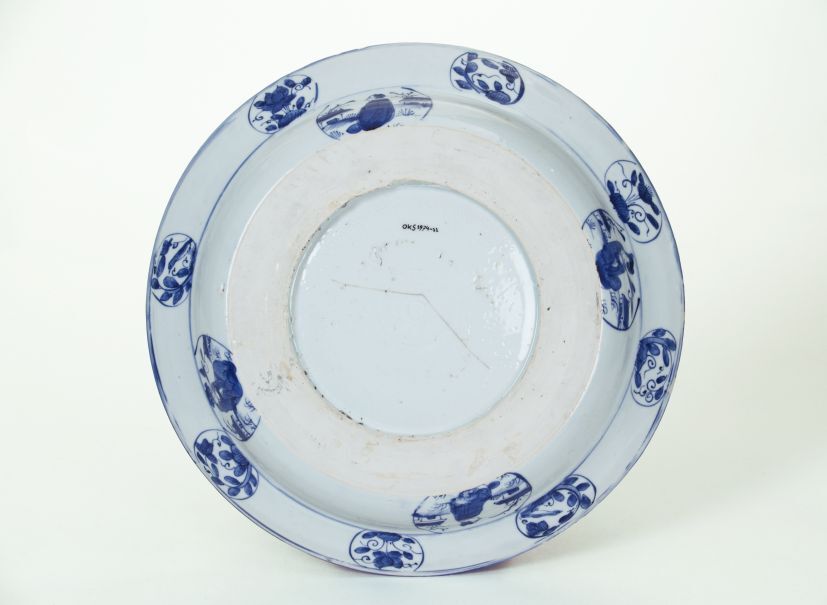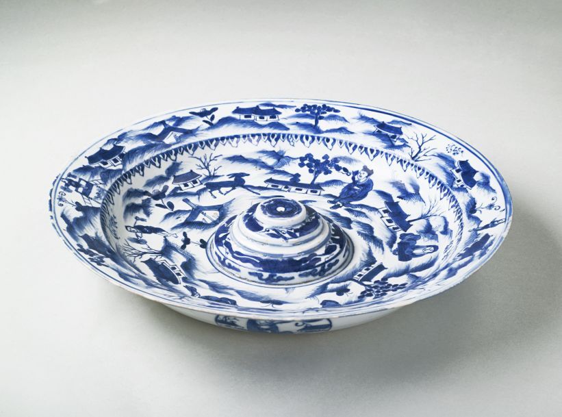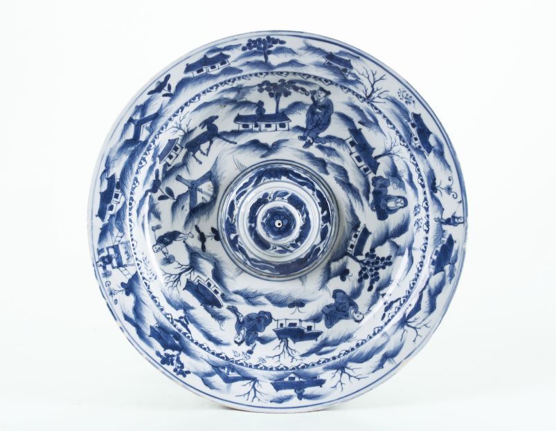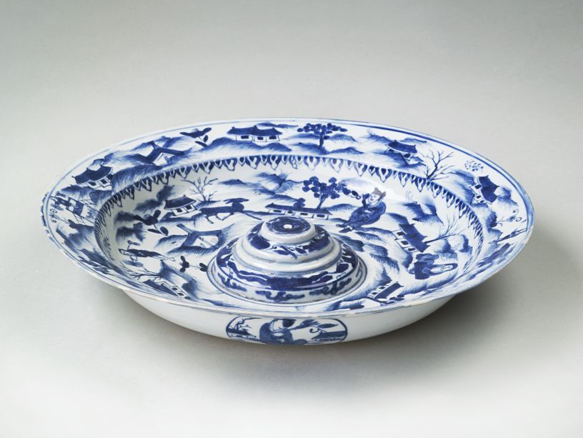 Zeldzame schotel in de traditie van het kraak porselein vervaardigd. Het stuk is bedoeld als onderschotel voor een schenkkan, waarvan de hoge holle voet over de kegel heen valt. Waarschijnlijk gebaseerd op een Europees model die de Chinezen kregen aangeleverd. Het is onduidelijk of hier een Chinese porseleine kan bijhoorde of dat er in Europa een kan bijgeveleverd werd van aardewerk of metaal. Tot dusver zijn er nog geen bijbehorende kannen gevonden. Een zelfde exemplaar bevindt zich in de Jan Menze van Diepen collectie, zie Jörg 2002, p. 64. (Nederlands)