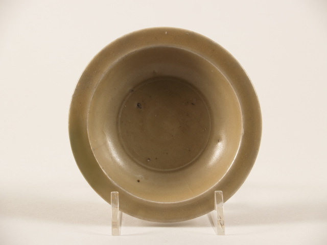 Bord met bruingroen glazuur en op de wand aan de onderzijde een decor van bladeren in reliëf. Celadon (Nederlands)
