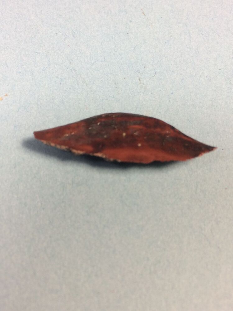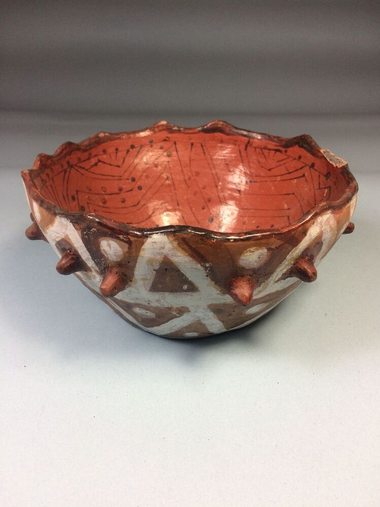 recht bodem; bol spreidende wand met boven het midden 14 uitsteeksels die in paren naast elkaar staan; onregelmatig golvende lip. Materiaal: rossige scherf; interieur bedekt met rode engobe en koud beschilderd met donker plantensap en overdekt met hars; exterieur - rode engobe op uitsteeksels, koude beschildering met plantensap en wite engobe (Nederlands)