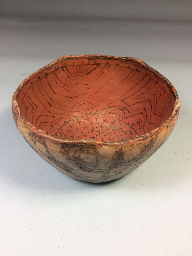en materiaal als OKS 1975/58 Versiering: interieur - "vliegtuigen in de lucht"-motief in lijnen en stippen exterieur en bodem - onregelmatig ornament met brede strepen en stippen (Nederlands)