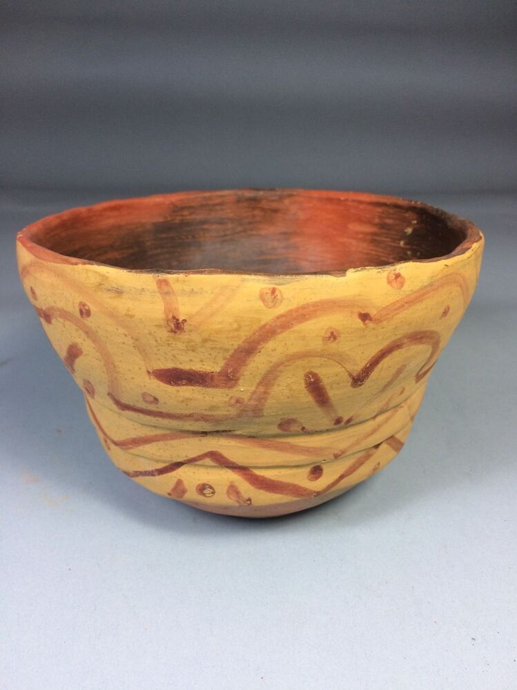 rechte bodem; j-vormig spreidende, vervolgens boven het midden bol spreidende wand die in 3 fases is geprofileerd. Mater...nament van brede rechte en golvende lijnen en stippen||Suriname||Aluman, Delfreda||Keramiekmuseum Princessehof OKS 1975-064