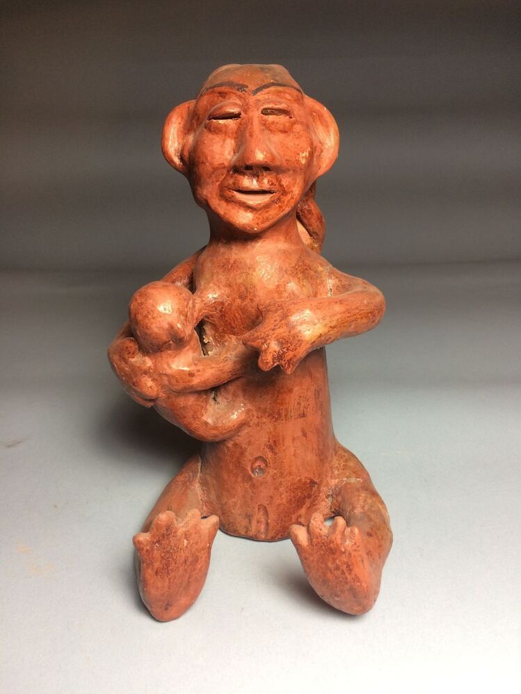 zittend vrouwsfiguur met kin aan linkerborst Materiaal: rossige scherf versierd met rode engobe en donkerkleurig plantensap (wenkbrauwen)||Suriname||Artist, Albertina||Keramiekmuseum Princessehof OKS 1975-065 |