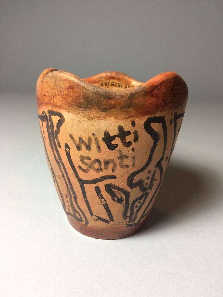 rechte bodem; zeer licht bol spreidende wand (bekervormig); golvende liprand. Materiaal: rossige scherf; brandplekken; v... wand, daartussen ornament van lijnen en stippen + de tekst Witti Santi||Suriname||Keramiekmuseum Princessehof OKS 1975-067