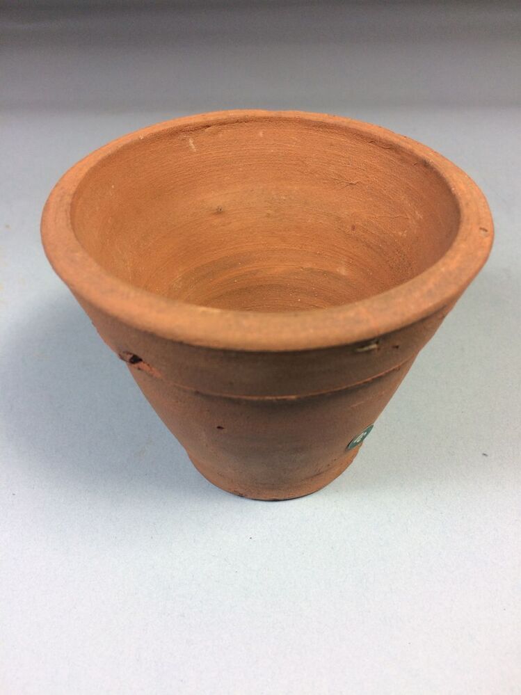rechte bodem met gat in het midden; recht spreidende wand, geprofileerde rand; draairingen Materiaal: oranje gele scherf (Nederlands)