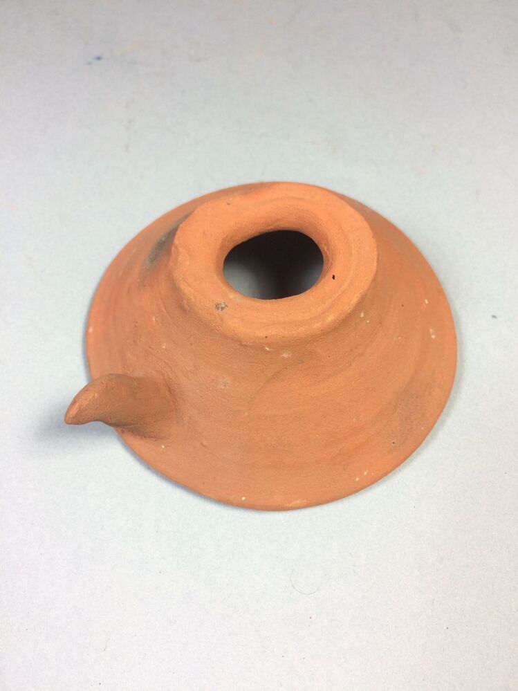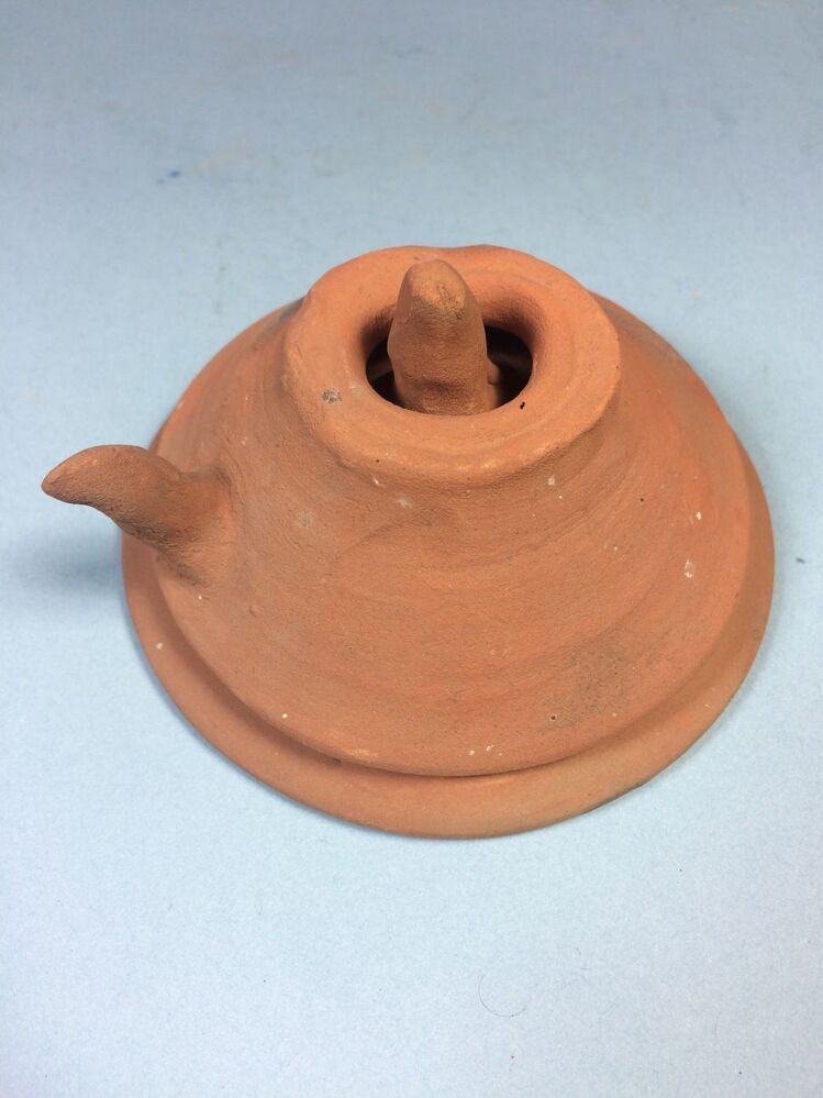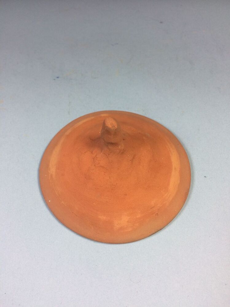 a. Holle wijd konische vorm uitlopend in een hoge punt waarover element b geschoven wordt. b. Holle wijd konische vorm met een gat bovenin en een langgerekt uitsteeksel (handvat) op onderste helft wand. Materiaal: oranje-gele scherf. (Nederlands)