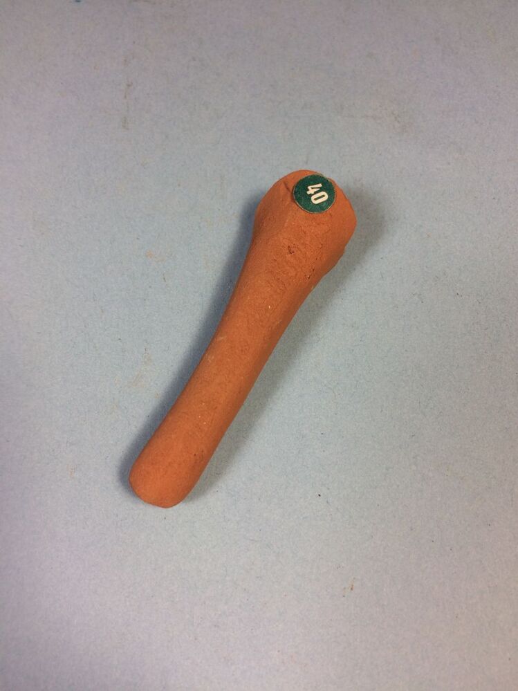 afgerond cilindrisch steeltje met in een hoek van circa 100° daar aan de kop materiaal: oranje-gele scherf (Nederlands)
