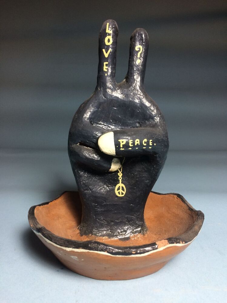 rechte bodem; spreidend wandje; gegolfde rand; uit plat verrijsd een plastiek in de vorm van een hand waarvan wijs-en middelvinger uitsteken (met tekst "love" en "?") en andere vingers naar binnen geslagen (op de duim de tekst "peace"; kettinkje in palm) materiaal: lichtbruine scherf; langs rand een witte en zwarte band; de hand grijs geschilderd met witte nagels; de letters in licht geel. Geheel overdekt met vernislaag. (Nederlands)